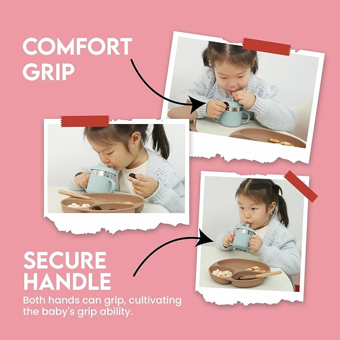 Our Stainless Steel Sippy Cup has capacity of 220 ml perfectly made for tiny hands, making it an ideal choice for weaning babies and toddlers. The ergonomic, double handle design promotes independent drinking.